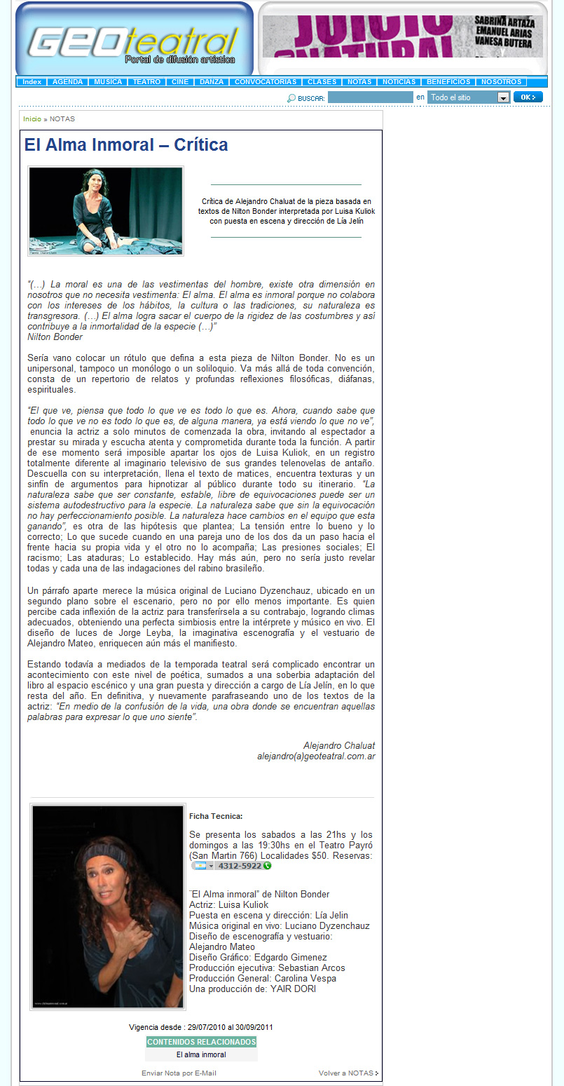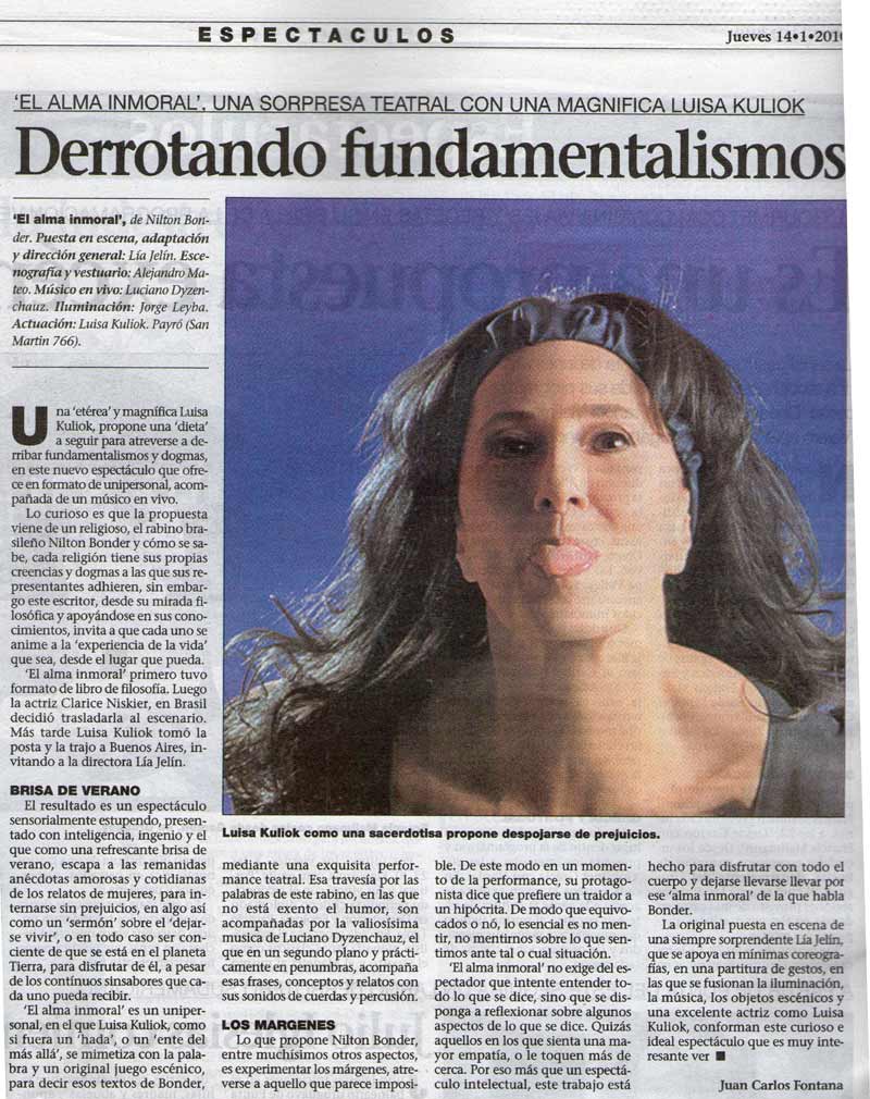 El autor nos cuenta que, a diferencia de las creencias tradicionales religiosas, el cuerpo es el ente moral, ya que debe someterse a los dictados de la naturaleza, mientras que la inmoralidad reside en el alma humana, ente subversivo y cuestionador de todo. En un monólogo cargado de espiritualidad y enseñanzas, pero también de humor, Luisa Kuliok brilla desnudando su propia alma inmoral, cuestionando las interpretaciones bíblicas y purificándose en un baño de verdad y sabiduría. Apoyándose en su rigurosa formación como bailarina solista de Dore Hoyer y en su larga trayectoria como coreógrafa experta en el manejo del espacio y como puestista de exitosísimas obras de teatro, Lía Jelín trabaja con el concepto de que el cuerpo es el que expresa las emociones por encima de la palabra dicha.