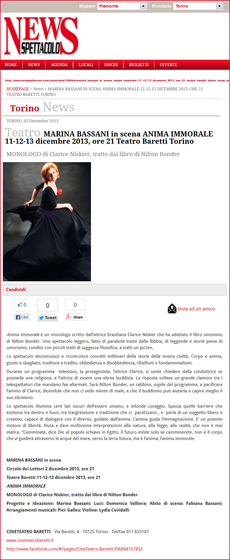 Teatro MARINA BASSANI in scena ANIMA IMMORALE 11-12-13 dicembre 2013, ore 21 Teatro Baretti Torino TORINO NEWS 03.2.02013