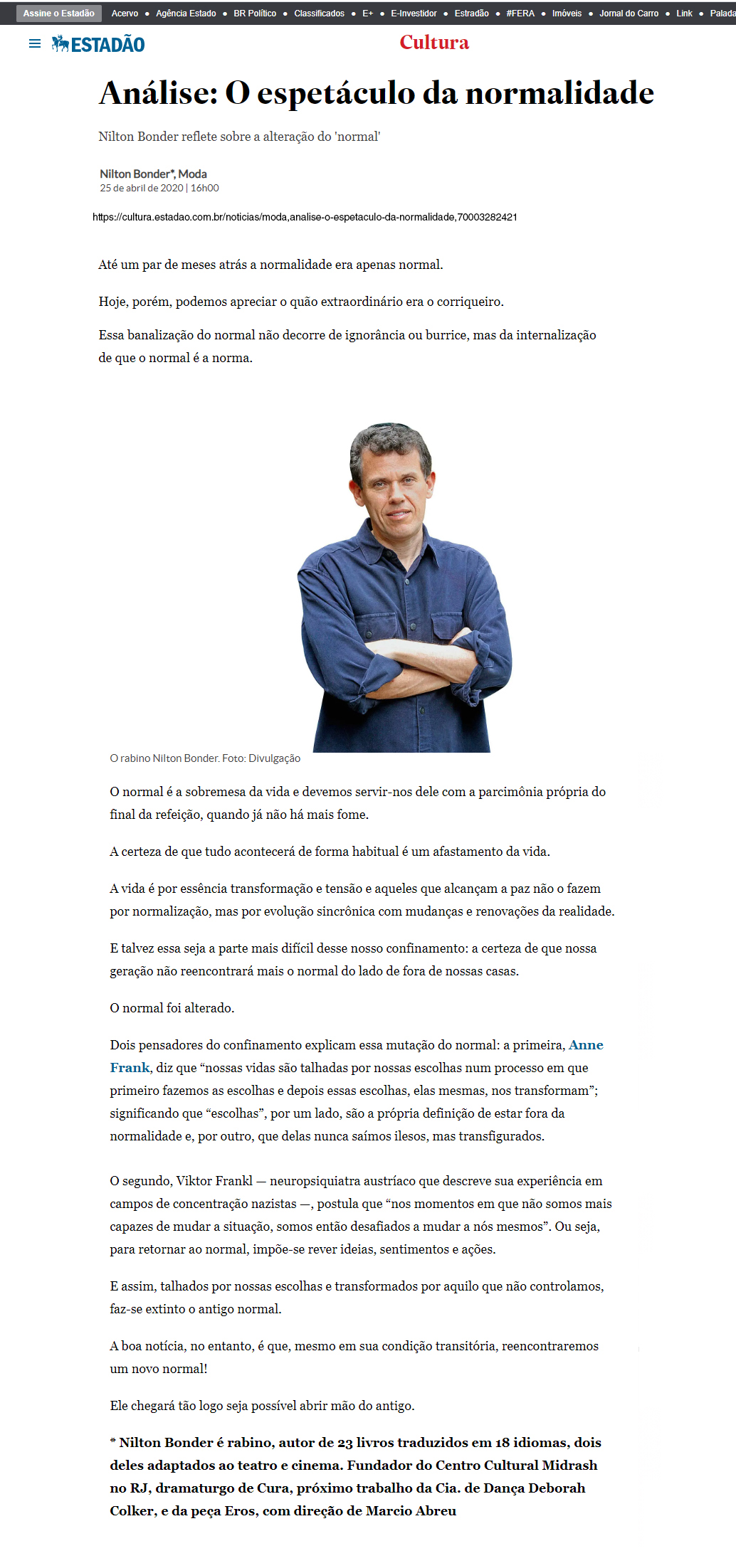O ESPETÁCULO DA NORMALIDADE ESTADÃO | 25.04.2020 https://cultura.estadao.com.br/noticias/moda,analise-o-espetaculo-da-normalidade,70003282421